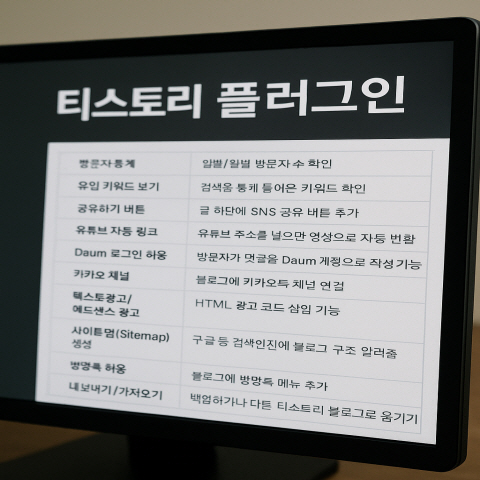 플러그인은 티스토리 블로그에 ‘기능’을 추가해 주는 작은 프로그램이에요. 꼭 필요한 기능만 골라서 ‘켜기/끄기’ 버튼만 누르면 되니, 복잡한 설정 없이 초보자도 쉽게 사용할 수 있답니다.
