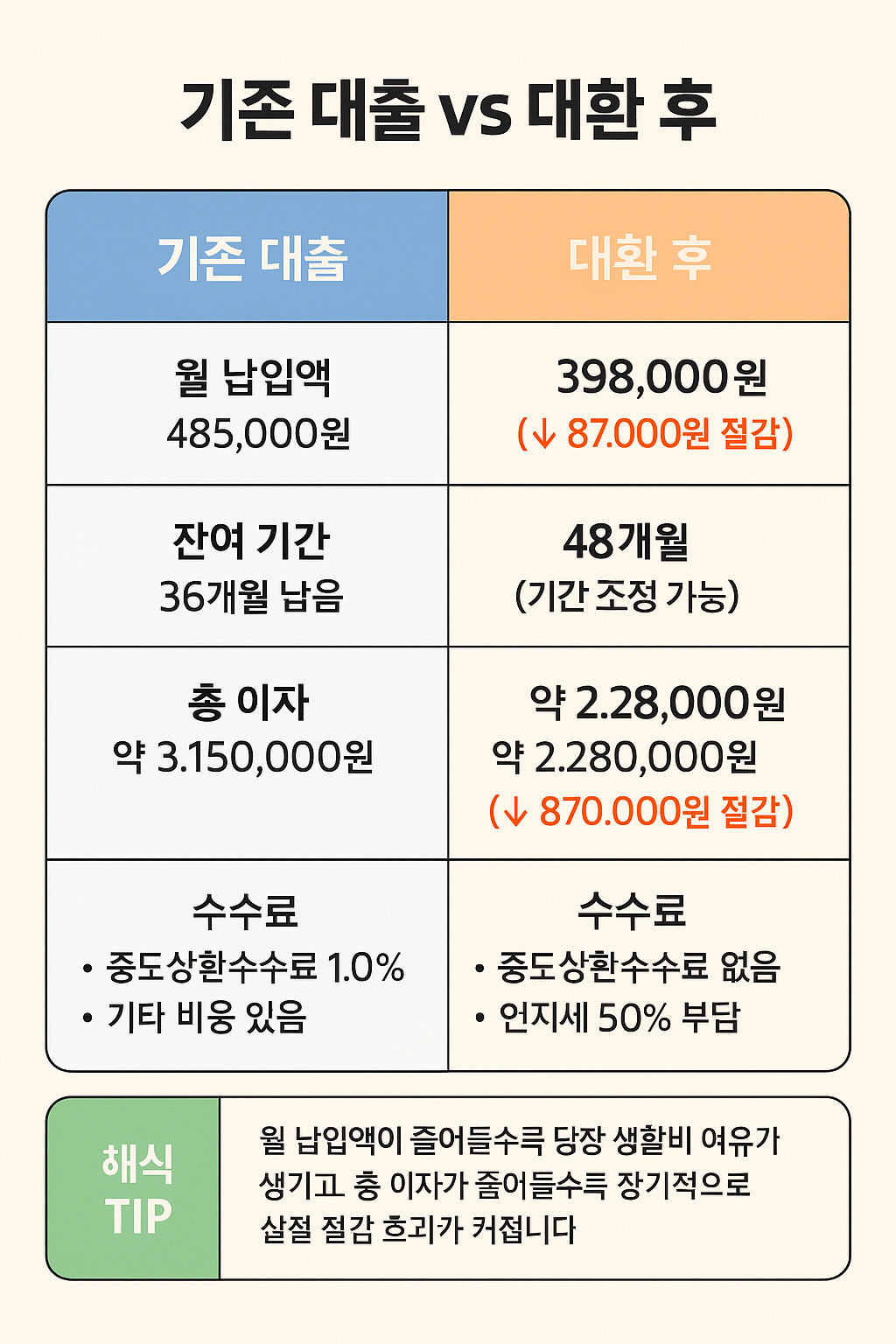 👉 최소한 ① 대환 후 예상 금리 ② 중도상환수수료·부대비용 ③ 잔여 기간을 기준으로, “월 납입액과 총 이자가 얼마나 차이 나는지”를 한 번 계산해 보는 것이 좋습니다. 그 결과 총 이자 절감액이 수수료보다 충분히 크고, 생활비에 무리 없는 월 납입액이라면 대환을 긍정적으로 검토해 볼 만한 상황이라고 볼 수 있습니다.